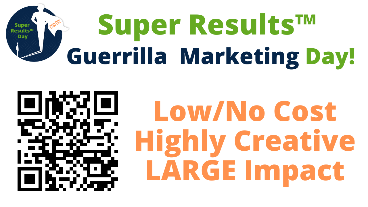 Monday, November 10th, we have a Super Results Day called Guerrilla Marketing Day. Join Blaine all day long as we crush your To-Do list while learning and implementing the low cost high impact methods of Guerrilla Marketing. (all VIRTUAL – do it from anywhere)
